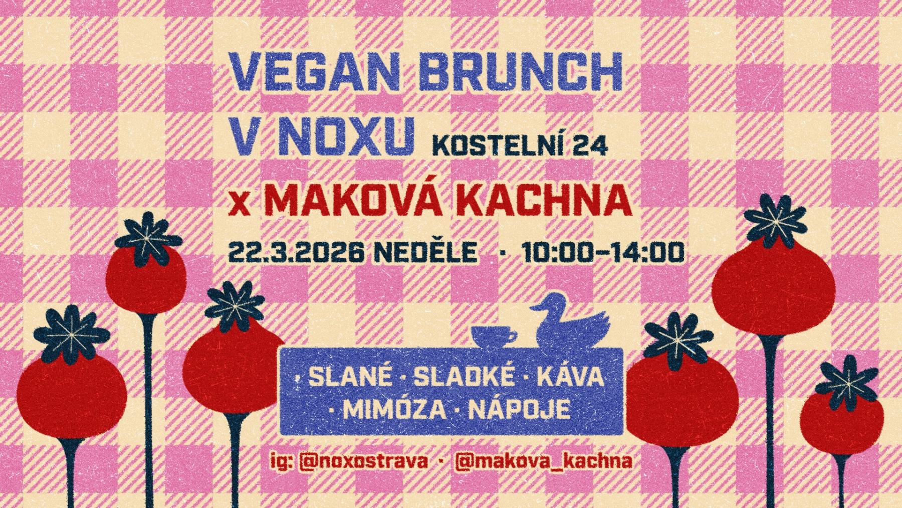 S potěšením vás zveme na VEGAN BRUNCH do Noxu na ulici Kostelní 24 v Ostravě. Můžete se těšit na bohaté a pečlivě připravené menu přímo z kuchyně Makové Kachny Tři hlavní jídla, sladké dobroty ke kávě, mimósa na "zpravoča", zdravé shoty a další pitička ze široké nabídky baru.